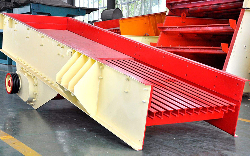 重型給料機(jī)主要由槽體、振動(dòng)電機(jī)、支撐彈簧等部件組成。GF系列給料機(jī)采用振動(dòng)電機(jī)作為激振源驅(qū)動(dòng)設(shè)備振動(dòng),迫使物料從給料端緩慢地推至排料端。與此同時(shí),對(duì)物料進(jìn)行篩分,使其粒度更加均勻。通常,在給料機(jī)的排料端裝備有一個(gè)棒條柵篩,通過(guò)它,分離出粒度小于各棒條條間距的物料,并將較大粒度的物料輸送到破碎機(jī)內(nèi)。通過(guò)改變振動(dòng)電機(jī)的激振力對(duì)給料機(jī)的給料能力進(jìn)行調(diào)節(jié),可以利用安裝在給料機(jī)下部的篩層對(duì)物料進(jìn)行進(jìn)一步的篩分。